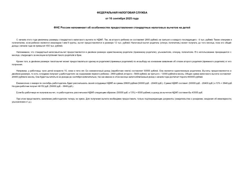 Статус: Информационный документ Текст документа: присутствует в коммерческой версии NormaCS Утвержден: ФНС России; Федеральная налоговая служба, 16.09.2025 Обозначение: Информация Наименование: ФНС России напоминает об особенностях предоставления стандартных налоговых вычетов на детей Дополнительные сведения: доступны через сетевой клиент NormaCS. После установки нажмите на иконку рядом с названием документа для его открытия в NormaCS