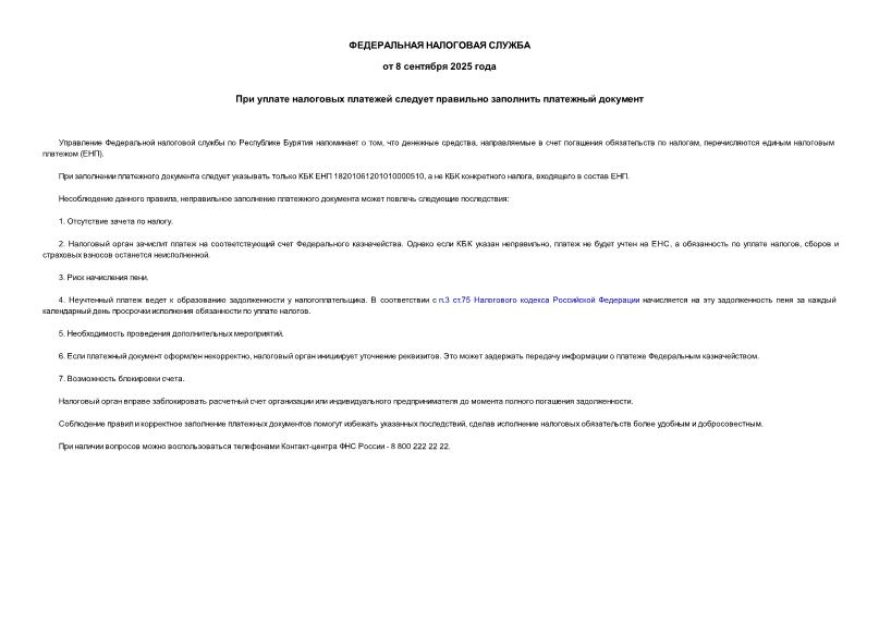 Статус: Информационный документ Текст документа: присутствует в коммерческой версии NormaCS Утвержден: ФНС России; Федеральная налоговая служба, 08.09.2025 Обозначение: Информация Наименование: При уплате налоговых платежей следует правильно заполнить платежный документ Дополнительные сведения: доступны через сетевой клиент NormaCS. После установки нажмите на иконку рядом с названием документа для его открытия в NormaCS